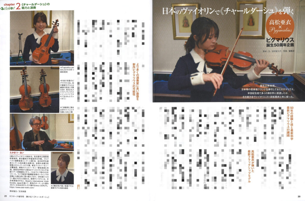 弦楽器専門誌「サラサーテ」2026年3月増刊号にて、自社新作弦楽器ブランド、Pygmalius(ピグマリウス)誕生50周年企画「日本のヴァイオリンでチャールダーシュを弾く~高松亜衣×Pygmalius」の特集記事、およびメーカー広告が掲載されました。